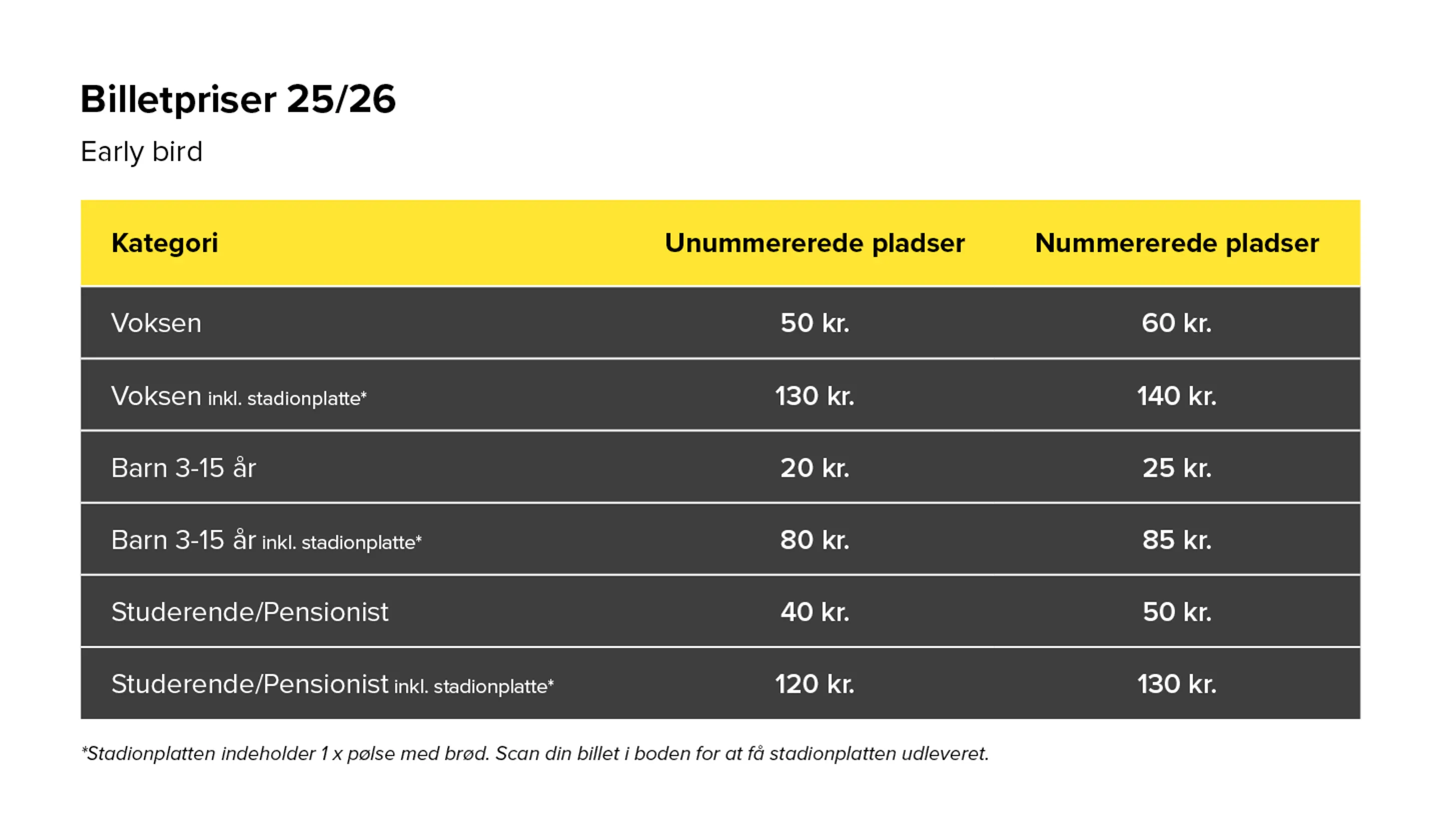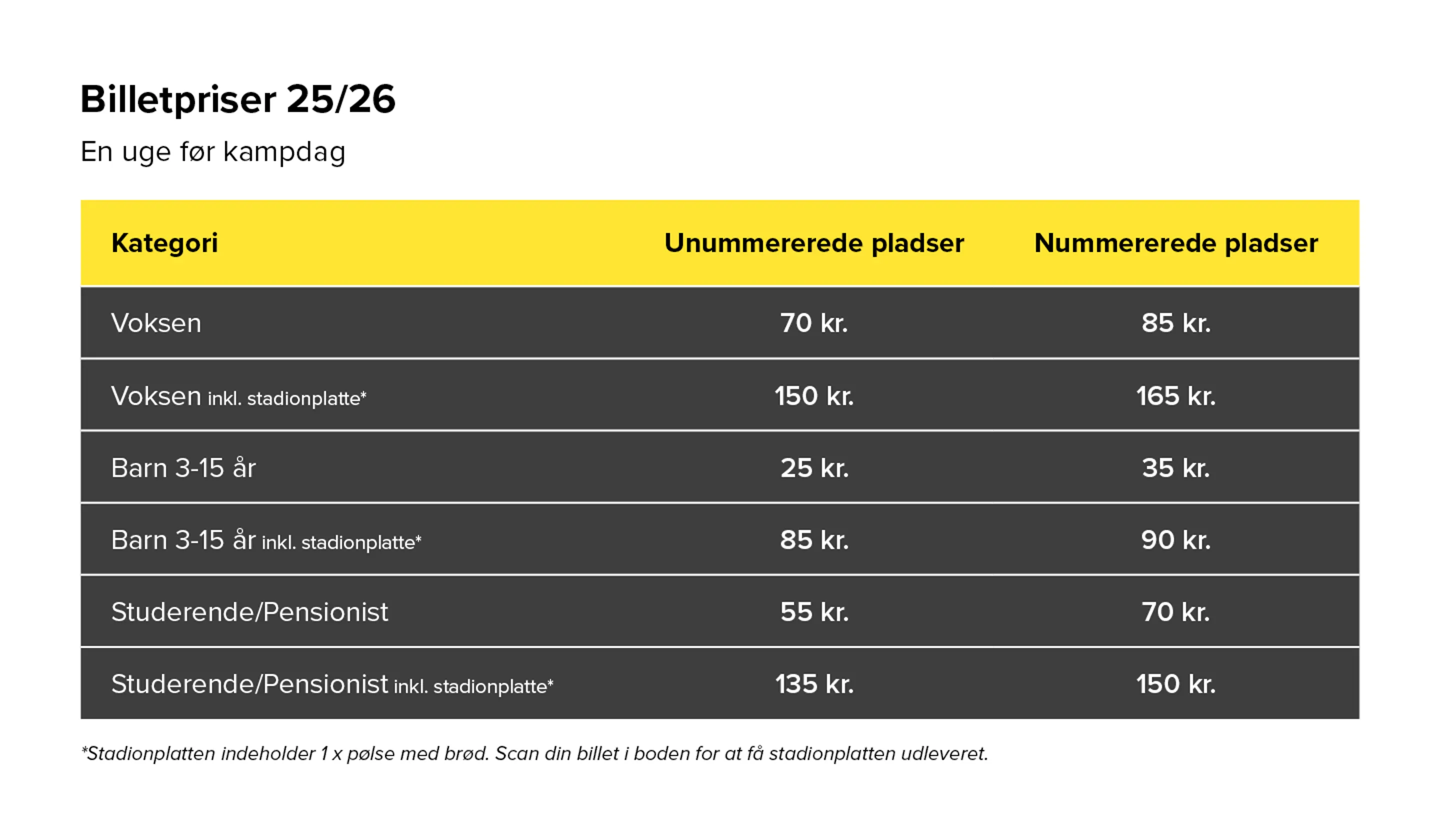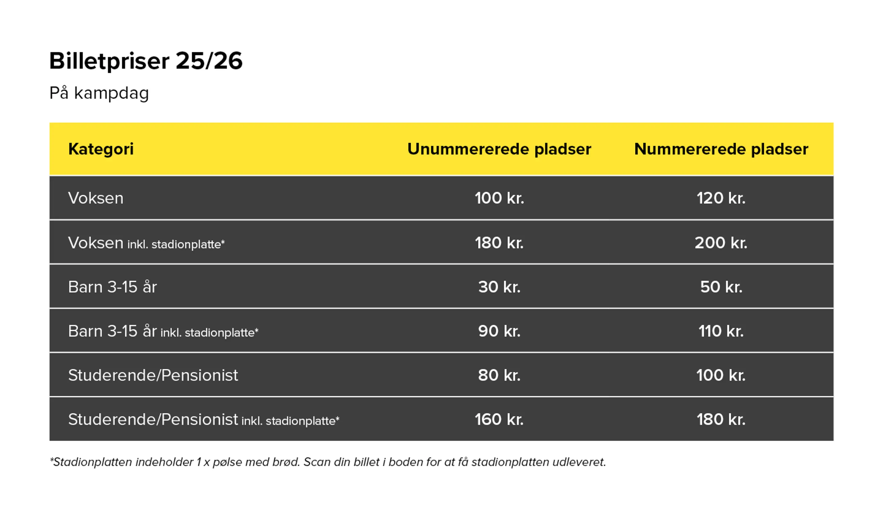 Billetter til vores hjemmekampe kan også købes i vores billetvogn på stadion på kampdagen. Billetvognen åbner 1 time før kampstart. Der er pålagt et gebyr for at købe fysiske billetter, så vi anbefaler at benytte dig af vores online billetside.