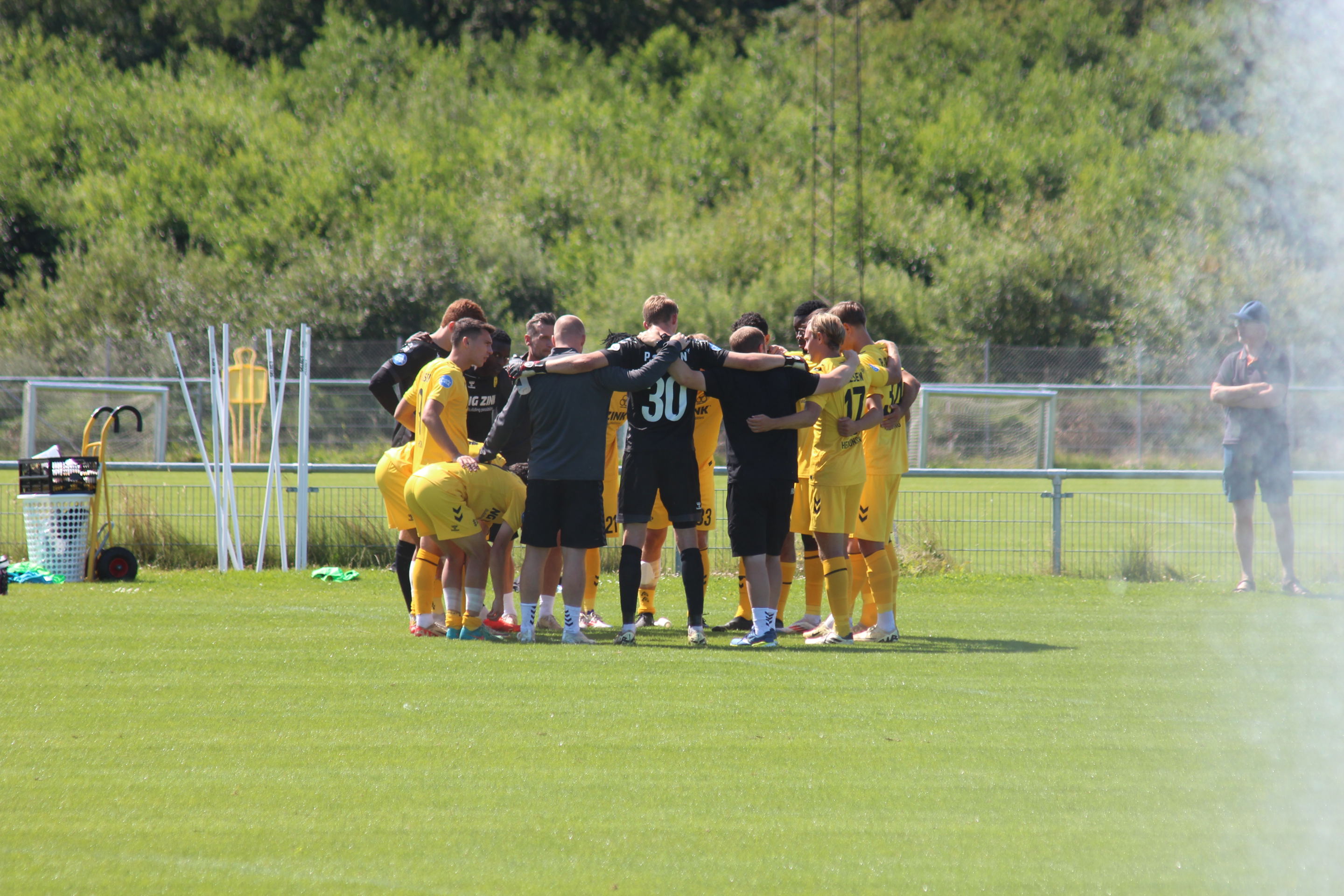 Den tidligere AC Horsens-angriber, Anders K. Jacobsen, var hård ved ”de gule”, da han scorede de første tre mål. Christian Gammelgaard scorede direkte på frispark til 4-0, og Damian van Bruggen lukkede kampen.