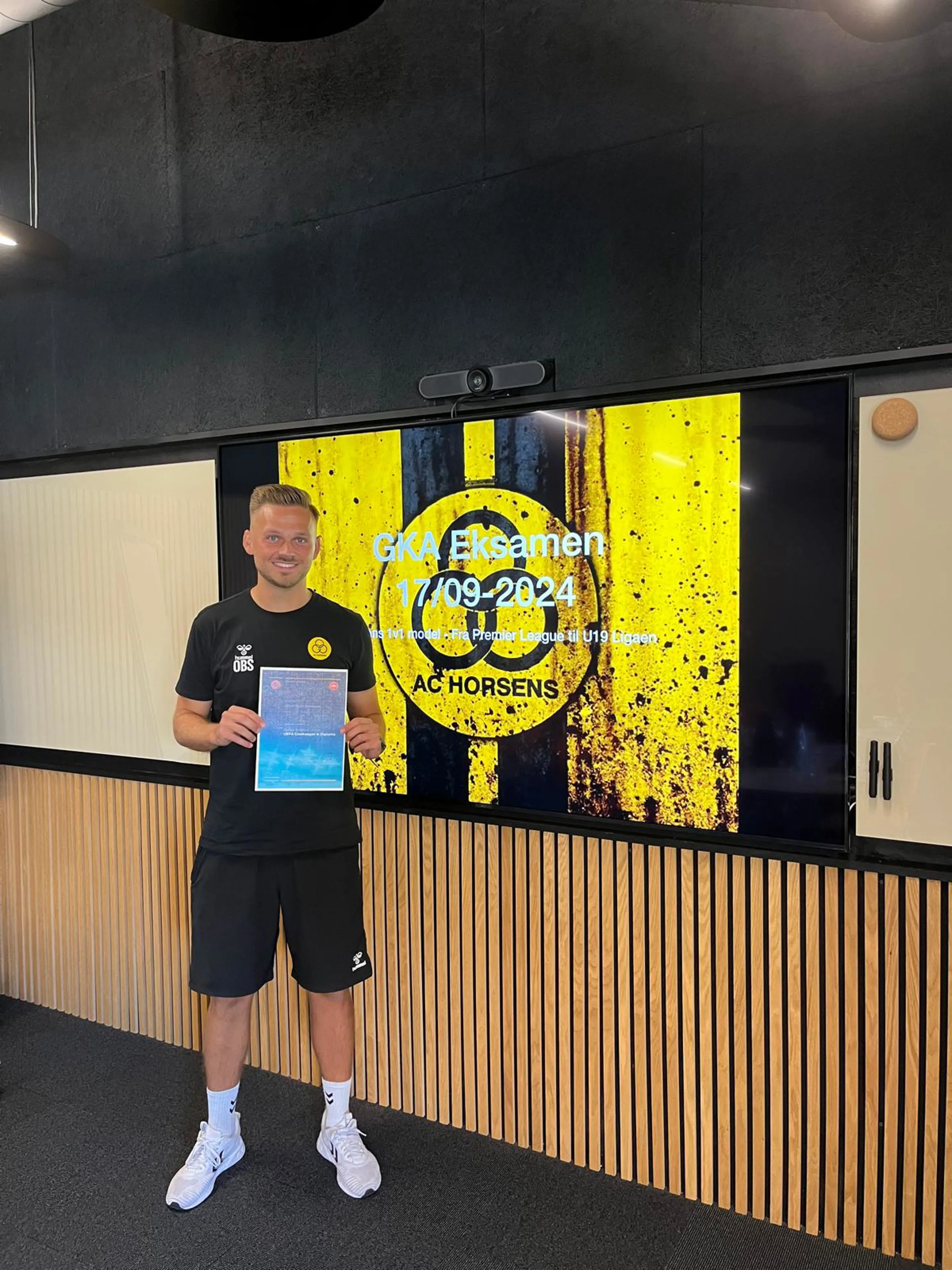 I denne uge fik han det synlige bevis på, at han efter veloverstået eksamen har erhvervet sig Europas højeste grad af målmandstrænerlicens.