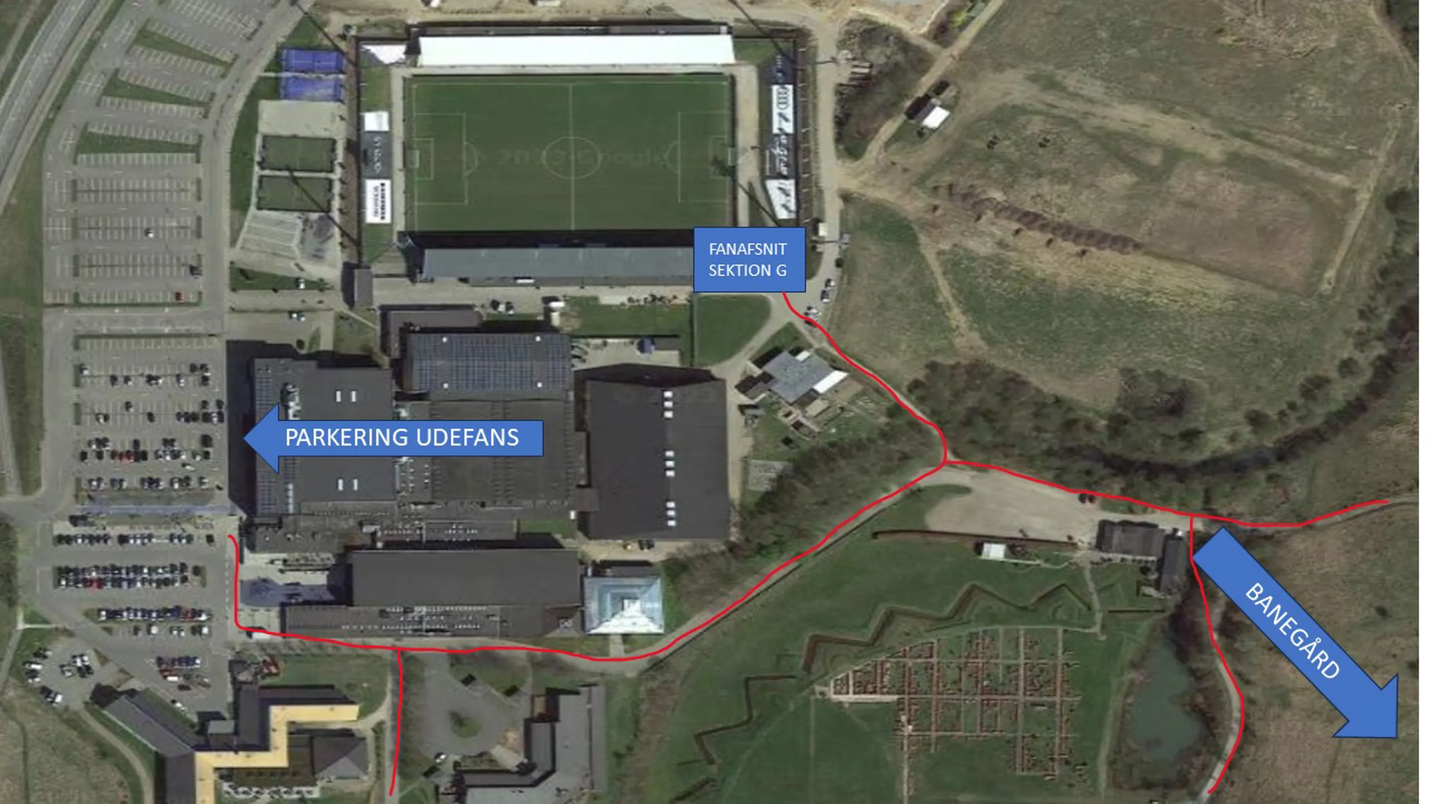 For at komme fra parkering til fanafsnit, så går man højre/syd om Fredericia Idrætscenter, ned mod Danhostel og Den Historiske Miniby. Man går IKKE venstre om Monjasa Park og forbi hovedindgangen til Monjasa Park.