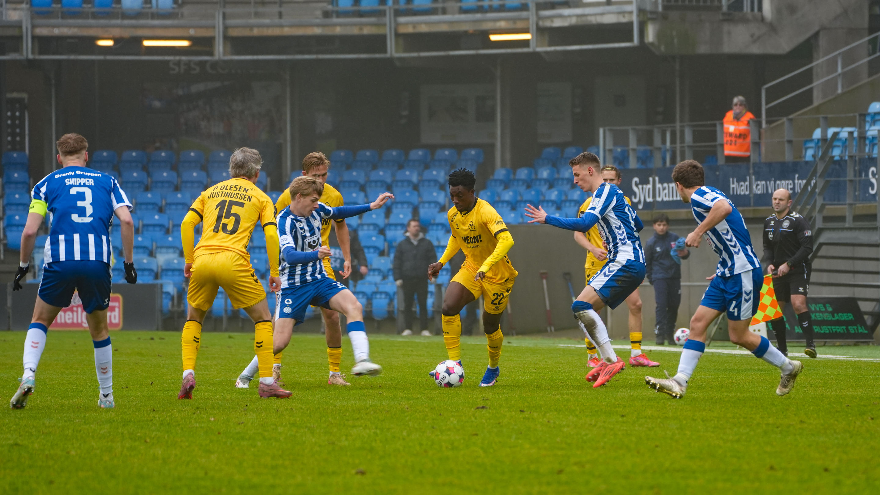 Patrick Olsen og Victor Palsson forsøgte sig begge med afslutninger frem mod pausen, men der blev ikke scoret flere mål i 1. halvleg.